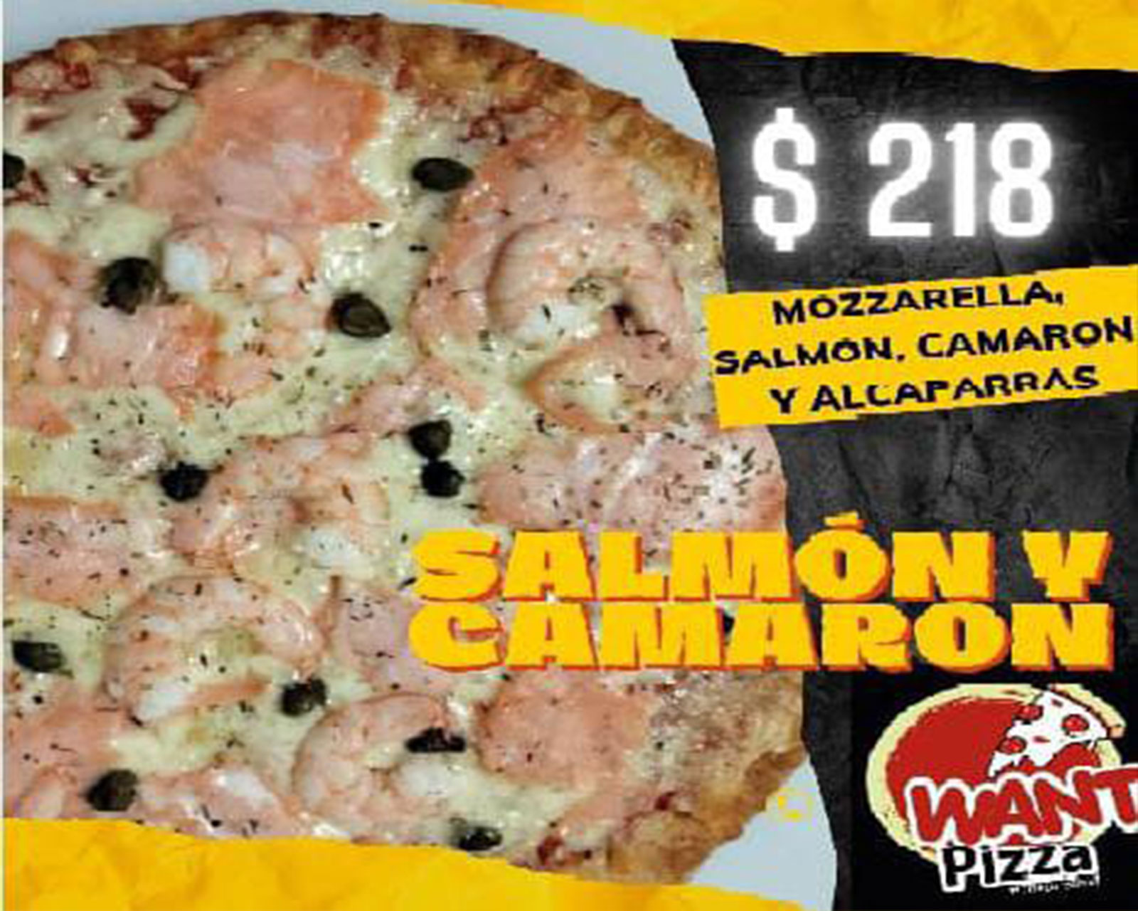 Mozzarela, láminas de salmón, camarón y alcaparras.